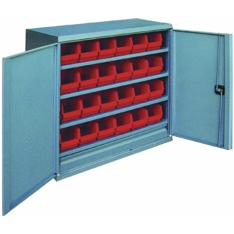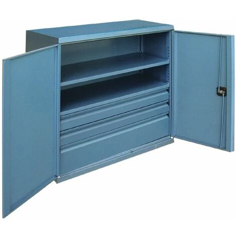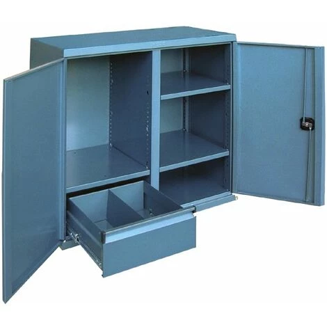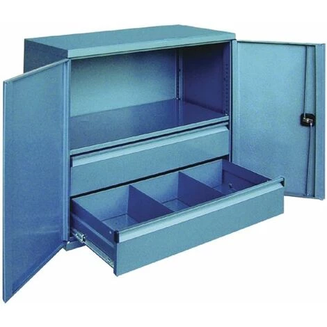 Choix entre plusieursaménagements intérieurs: étagères réglables en hauteur par 25mm, capacité 200kg Tiroirs amovibles, capacité 50kg Avec bacs de rangement de différentes tailles Construction en acier 10/10mm recouvert de laque martelée bleur.