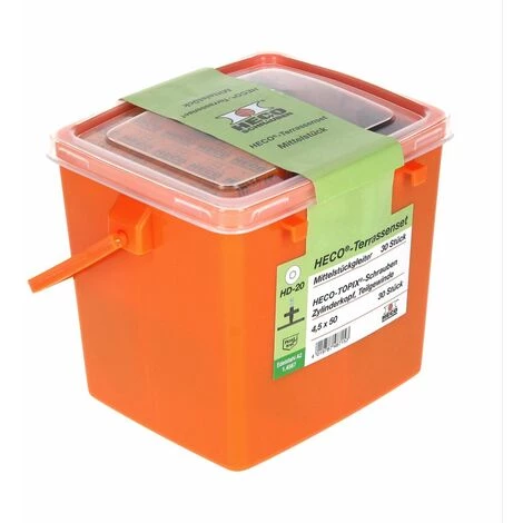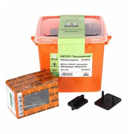 Le set de fixations pour terrasse du fabricant HECO offre à la fois une fixation invisible, un espaceur et une protection de la structure du bois. Les lames de terrasses contenues dans ce set sont conçues pour des planches de 50 mm de large et de 22 à 40 mm d’épaisseur, avec une rainure centrale d’au moins 5 et 10 mm de large. Cet set contient également les vis pour plancher HECO TOPIX à tête ronde en acier inoxydable A2. Il vous garantit ainsi un vissage d’une grande précision et un gain de temps considérable. Le set de fixations pour terrasse de la maison HECO vous permettra ainsi de fixer de manière invisible les lames de terrasse tout en garantissant une protection de la structure du bois. Il ne permet en effet pas de contact direct bois sur bois, conférant ainsi une ventilation entre lame et lambourde, et vous protégeant donc contre les moisissures et les attaques fongiques. Les embouts HD et T-Drive (Torx) sont compatibles à 100% avec les vis HD et T-Drive.
