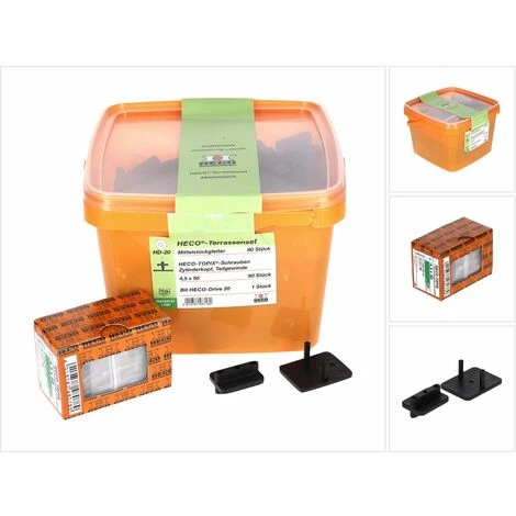 Le set de fixations pour terrasse du fabricant HECO offre à la fois une fixation invisible, un espaceur et une protection de la structure du bois. Les lames de terrasses contenues dans ce set sont conçues pour des planches de 50 mm de large et de 22 à 40 mm d’épaisseur, avec une rainure centrale d’au moins 5 et 10 mm de large. Cet set contient également les vis pour plancher HECO TOPIX à tête ronde en acier inoxydable A2. Il vous garantit ainsi un vissage d’une grande précision et un gain de temps considérable. Le set de fixations pour terrasse de la maison HECO vous permettra ainsi de fixer de manière invisible les lames de terrasse tout en garantissant une protection de la structure du bois. Il ne permet en effet pas de contact direct bois sur bois, conférant ainsi une ventilation entre lame et lambourde, et vous protégeant donc contre les moisissures et les attaques fongiques. Les embouts HD et T-Drive (Torx) sont compatibles à 100% avec les vis HD et T-Drive.